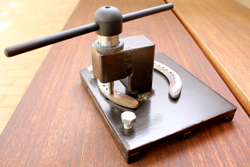 Whether High Speed Steel or Carbon Steel taps are used is one of personal preference. The generally held view seems to be that for jobbing work the H.S.S. tap will cut a more accurate thread, BUT will not be as hard as Carbon Steel and will blunt sooner. H.S.S. is also more expensive than Carbon Steel, but as one of the problems experienced by farriers is that studs tend to fall out during use, the additional cost may be offset by the improved thread. Only a "second-cut" tap is necessary, providing care is taken to apply equal pressure to both sides of the handle. The pillar is manufactured from sections of 40mm square solid bar which avoids any possibility of flexing. The pillar bush is made from "Vesconite"® which is self-lubricating. There are 3 bars welded to the 10mm steel base. Two (16mm square) on the outer edges would be utilised when the stand is on a flat surface and the centre bar (12mm square) can be used to hold the stand in a vice. There are 2 bolts on the front edge are to stop the horse shoe turning when tapping is in progress. These may be removed should a user find they do not suit his/her method of operating.